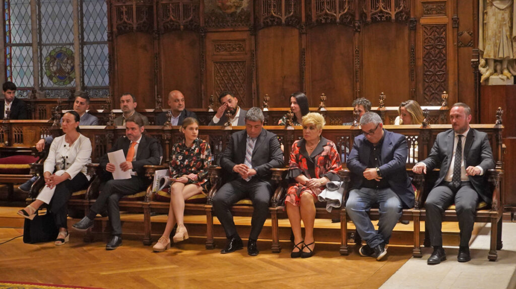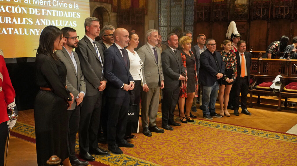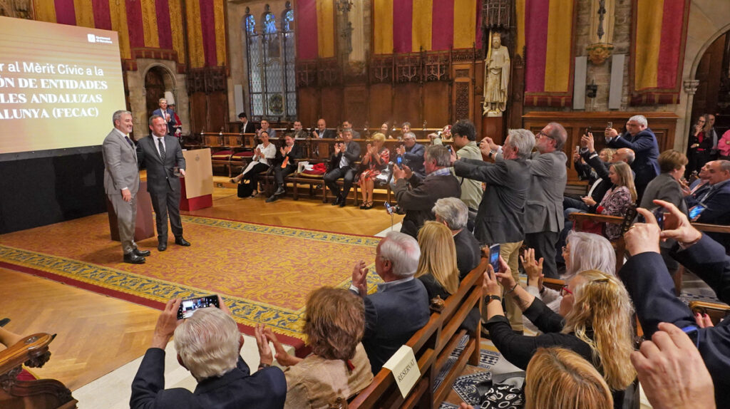 La Federación de Entidades Culturales Andaluzas en Catalunya (FECAC) vivió ayer un momento histórico en el Saló de Cent del Ayuntamiento de Barcelona al recibir la Medalla de Oro al Mérito Cívico del consistorio barcelonés. En la presentación de la Feria de Abril del año pasado, Jaume Collboni, por entonces candidato a la alcaldía barcelonesa, ya anunció que intentaría que la federación recibiera tal reconocimiento. Ayer, ya como alcalde, pudo hacer realidad la promesa que se había concretado en el pleno de septiembre de la capital catalana, cuando todos los grupos municipales acordaron entregar dicha medalla «por su tarea de difusión de la cultura y las tradiciones andaluzas, así como el fomento del intercambio de conocimientos entre culturas, y con motivo del 50 aniversario de la Feria de Abril de Catalunya y la 50 Romería del Rocío de Catalunya».