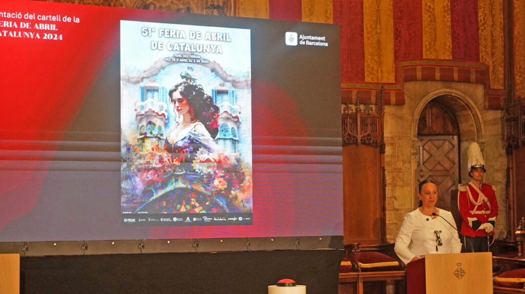 El acto en el Saló de Cent del consistorio barcelonés sirvió también para presentar el cartel de la 51 Feria de Abril de Catalunya, que se llevará a cabo en el Parc del Fòrum del 26 de abril al 5 de mayo. Obra de la fotógrafa barcelonesa de raíces gaditanas María del Carmen Longobardo, es todo un canto de amor a Barcelona. Representa una flamenca que camino a la Feria pasa por delante de la Casa Batlló y se enamora de su arquitectura, de sus colores, de sus texturas. Se mimetiza con el arte modernista de Gaudí para crear un traje de flamenca con el trencadís que utilizó el arquitecto catalán, con los botones en su espalda que se asemejan al dragón que corona el tejado del edificio, y la peineta es la cruz de cuatro brazos del edificio. Al cuello, la medalla de la Virgen del Rocío, porque después de la Feria llega la Romería.