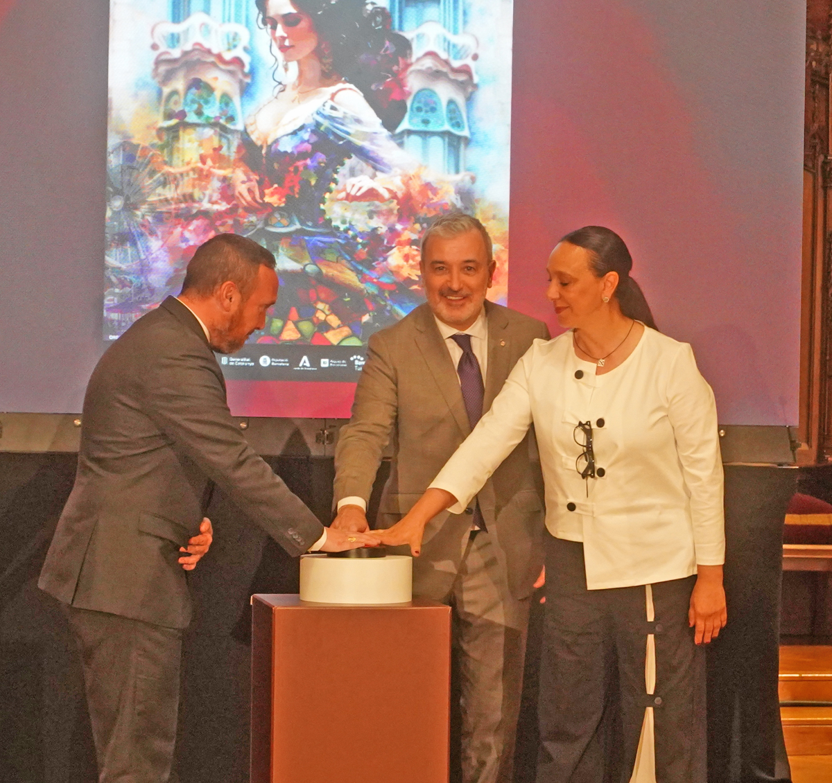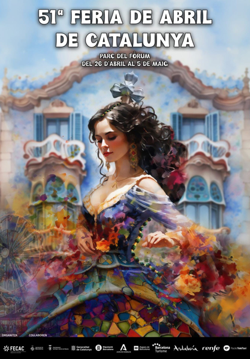 El acto en el Saló de Cent del consistorio barcelonés sirvió también para presentar el cartel de la 51 Feria de Abril de Catalunya, que se llevará a cabo en el Parc del Fòrum del 26 de abril al 5 de mayo. Obra de la fotógrafa barcelonesa de raíces gaditanas María del Carmen Longobardo, es todo un canto de amor a Barcelona. Representa una flamenca que camino a la Feria pasa por delante de la Casa Batlló y se enamora de su arquitectura, de sus colores, de sus texturas. Se mimetiza con el arte modernista de Gaudí para crear un traje de flamenca con el trencadís que utilizó el arquitecto catalán, con los botones en su espalda que se asemejan al dragón que corona el tejado del edificio, y la peineta es la cruz de cuatro brazos del edificio. Al cuello, la medalla de la Virgen del Rocío, porque después de la Feria llega la Romería.