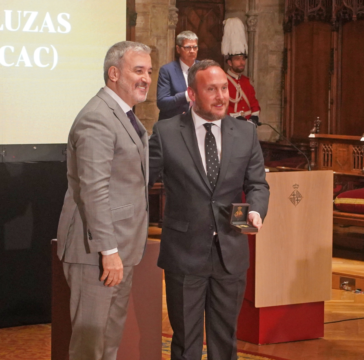 La Federación de Entidades Culturales Andaluzas en Catalunya (FECAC) vivió ayer un momento histórico en el Saló de Cent del Ayuntamiento de Barcelona al recibir la Medalla de Oro al Mérito Cívico del consistorio barcelonés. En la presentación de la Feria de Abril del año pasado, Jaume Collboni, por entonces candidato a la alcaldía barcelonesa, ya anunció que intentaría que la federación recibiera tal reconocimiento. Ayer, ya como alcalde, pudo hacer realidad la promesa que se había concretado en el pleno de septiembre de la capital catalana, cuando todos los grupos municipales acordaron entregar dicha medalla «por su tarea de difusión de la cultura y las tradiciones andaluzas, así como el fomento del intercambio de conocimientos entre culturas, y con motivo del 50 aniversario de la Feria de Abril de Catalunya y la 50 Romería del Rocío de Catalunya».