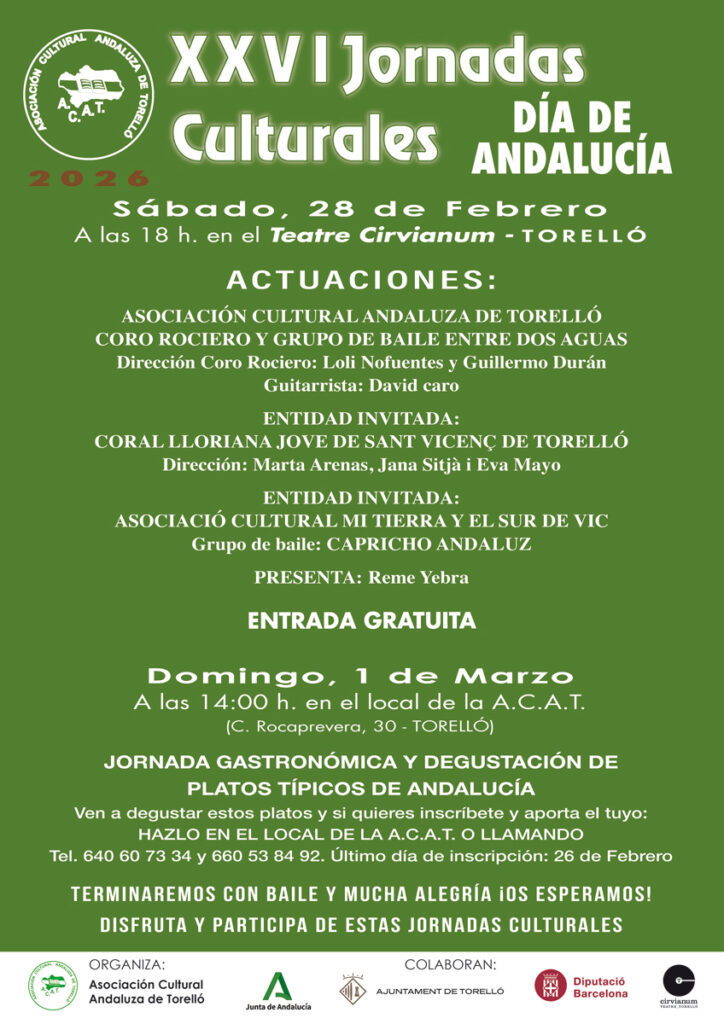 La Asociación Cultural Andaluza de Torelló celebra el primer fin de semana de marzo los actos por el Día de Andalucía, que comenzarán el sábado, 28 de febrero, en el Teatre Cirvianum de Torelló con las actuaciones de los grupos de teatro y de baile y el coro rociero de la entidad, así como las asociaciones invitadas, la Coral Lloriana Jove de Sant Vicenç de Torelló, y la Asociació Cultural Mi tierra y el Sur de Vic. La entrada es gratuita.